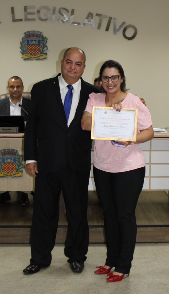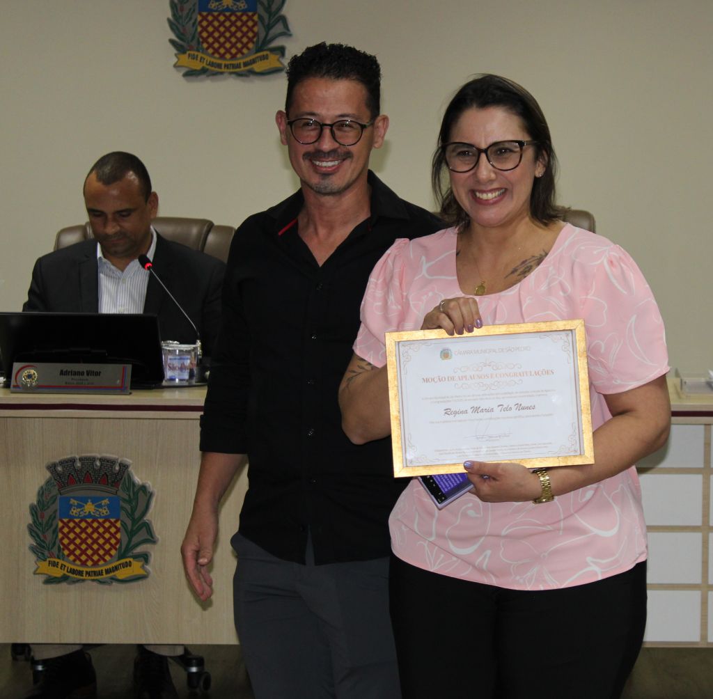 Regina Maria Telo Nunes, enfermeira e biomédica, recebeu moção de aplausos e congratulações das mãos do vereador Aldo Enfermeiro (PP). Ela tem trajetória marcada por importantes contribuições nas áreas científica, laboratorial e hospitalar, exerceu serviço público e militar como biomédica na Força Aérea Brasileira e tem experiência de dez anos como enfermeira do Hospital Albert Einstein e dois anos no Hospital Beneficente São Lucas. Colabora com a Casa dos Velhinhos, sendo referência na cidade. É especialista em exames toxicológicos.