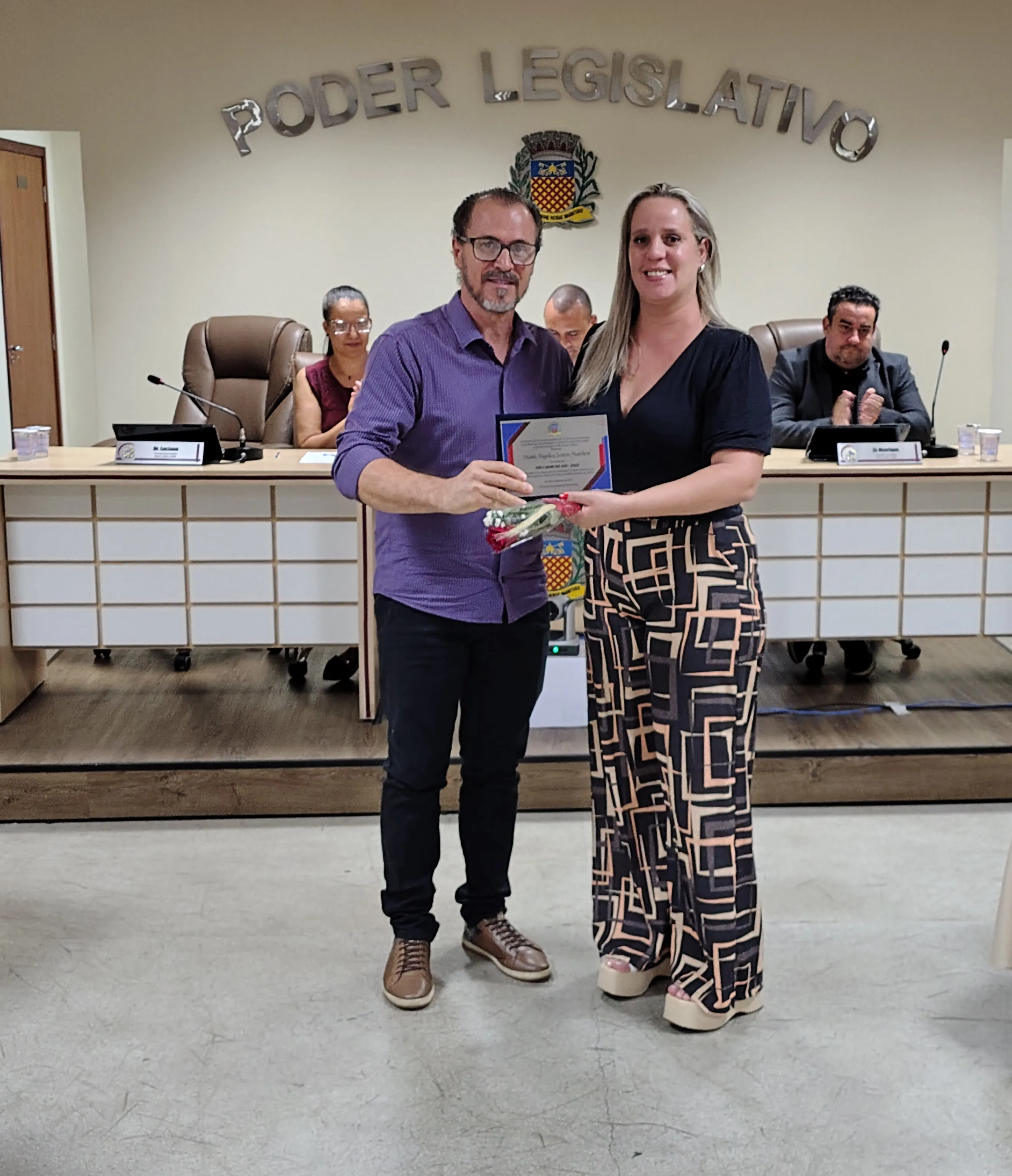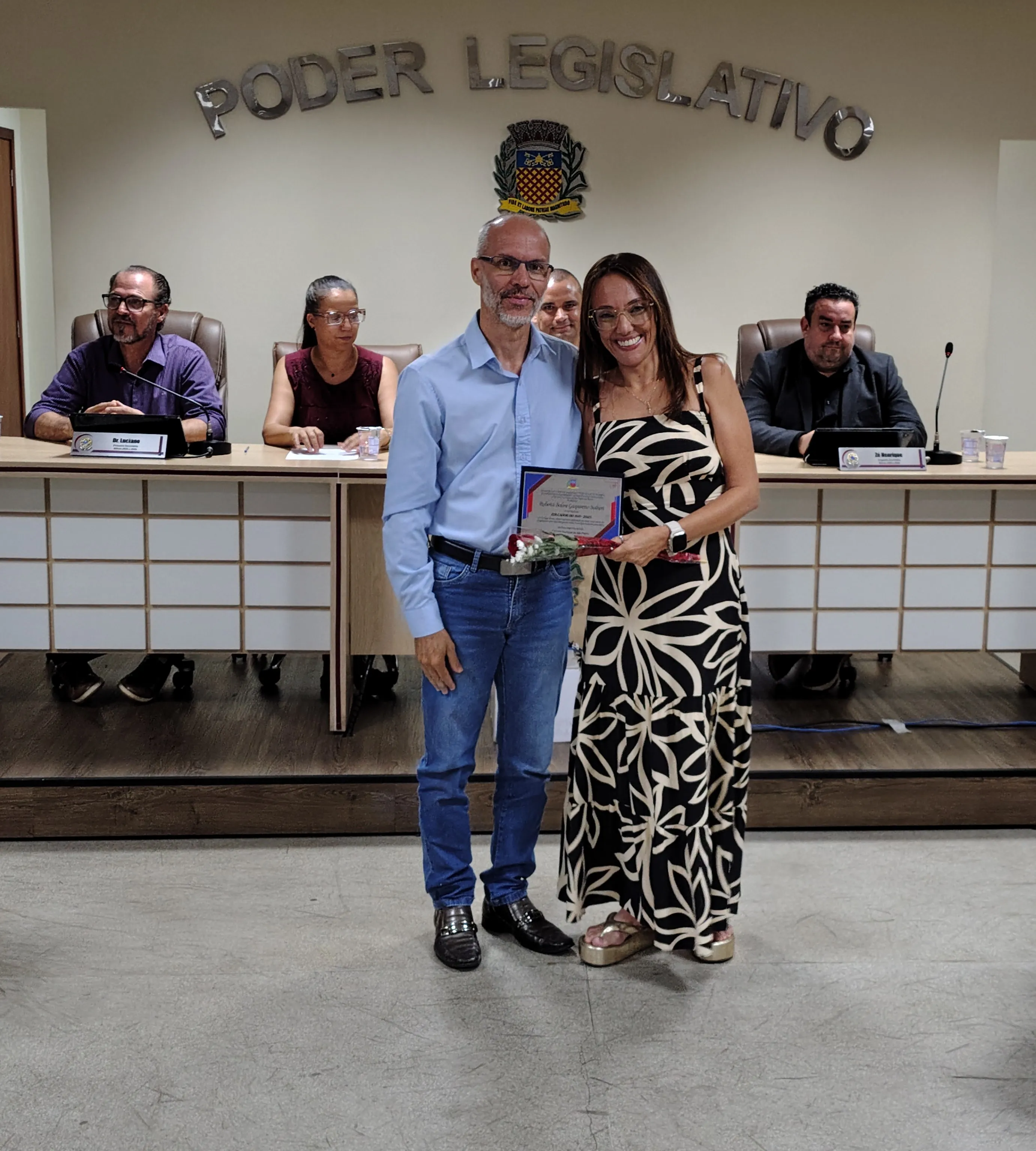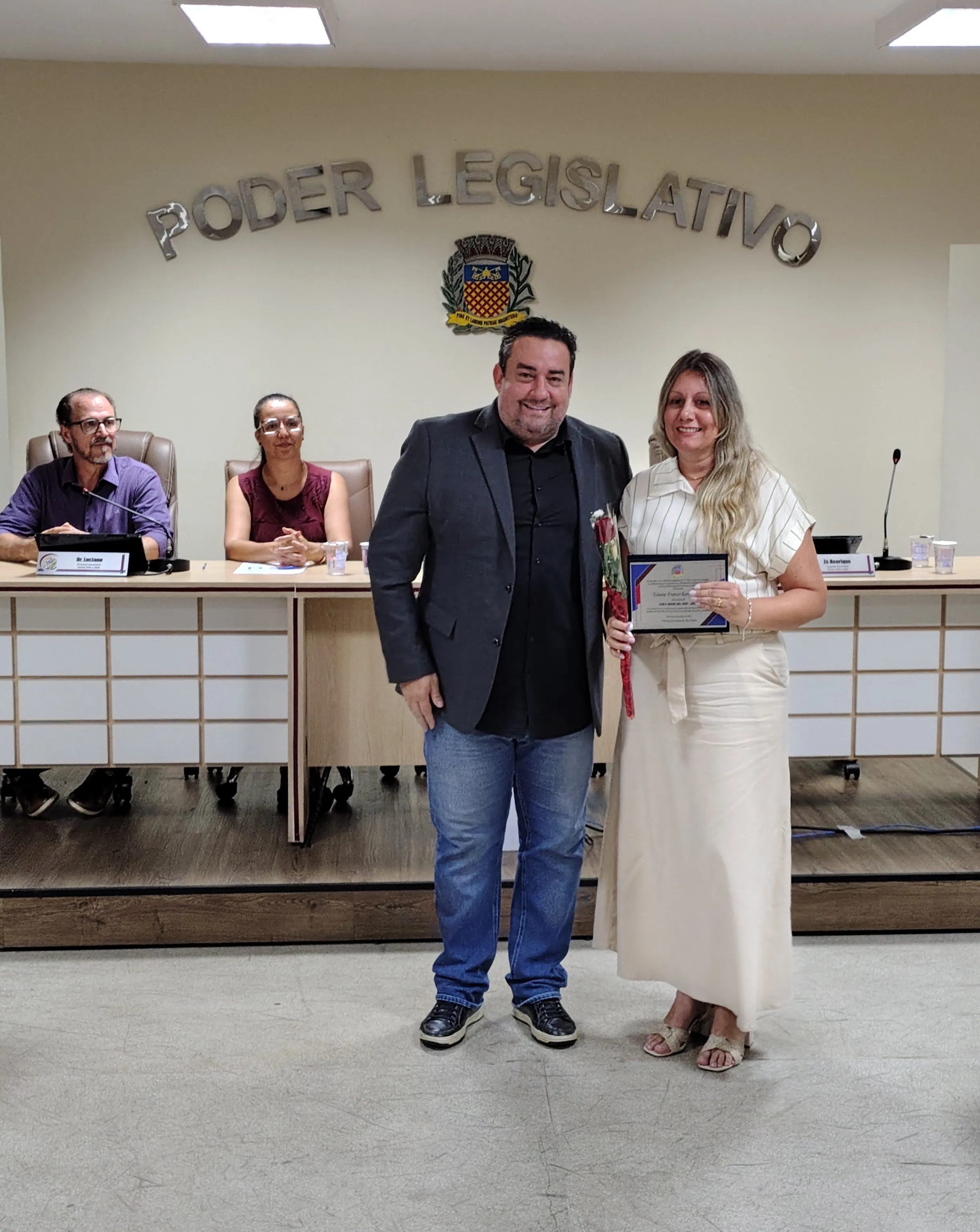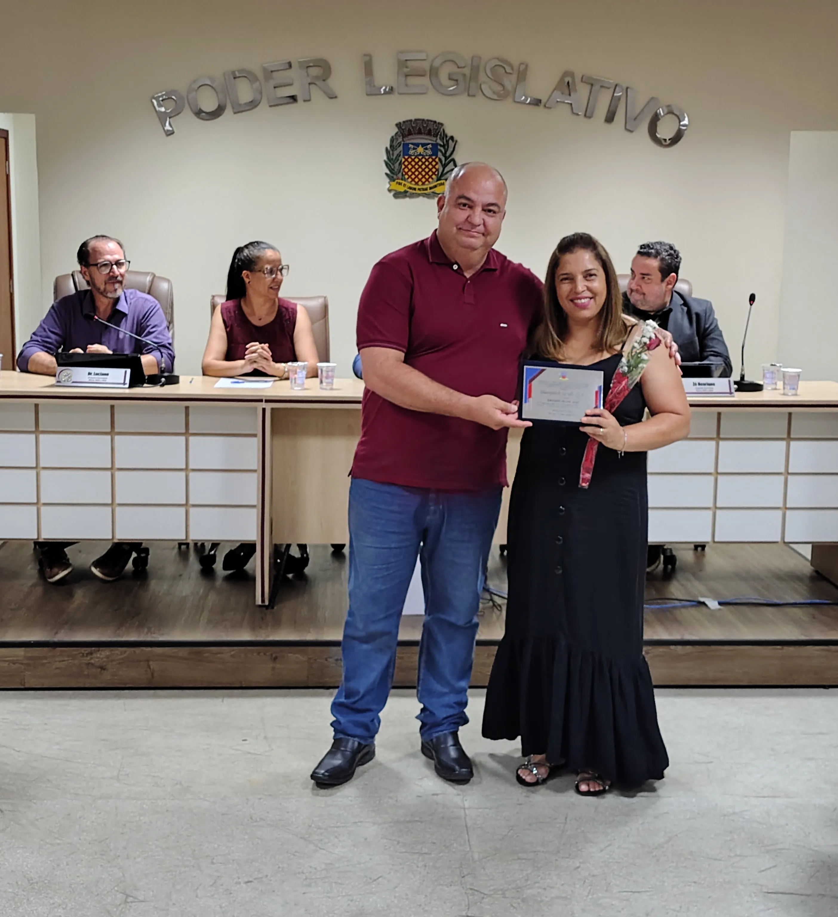 A solenidade foi conduzida pelo vereador Adriano Vitor, presidente da Casa. Além dele, a mesa central foi composta pelos vereadores Zé Henrique Pereira e Luciano Mazzonetto e pela secretária de Educação, Samanta Alves Almozara Bontorim.