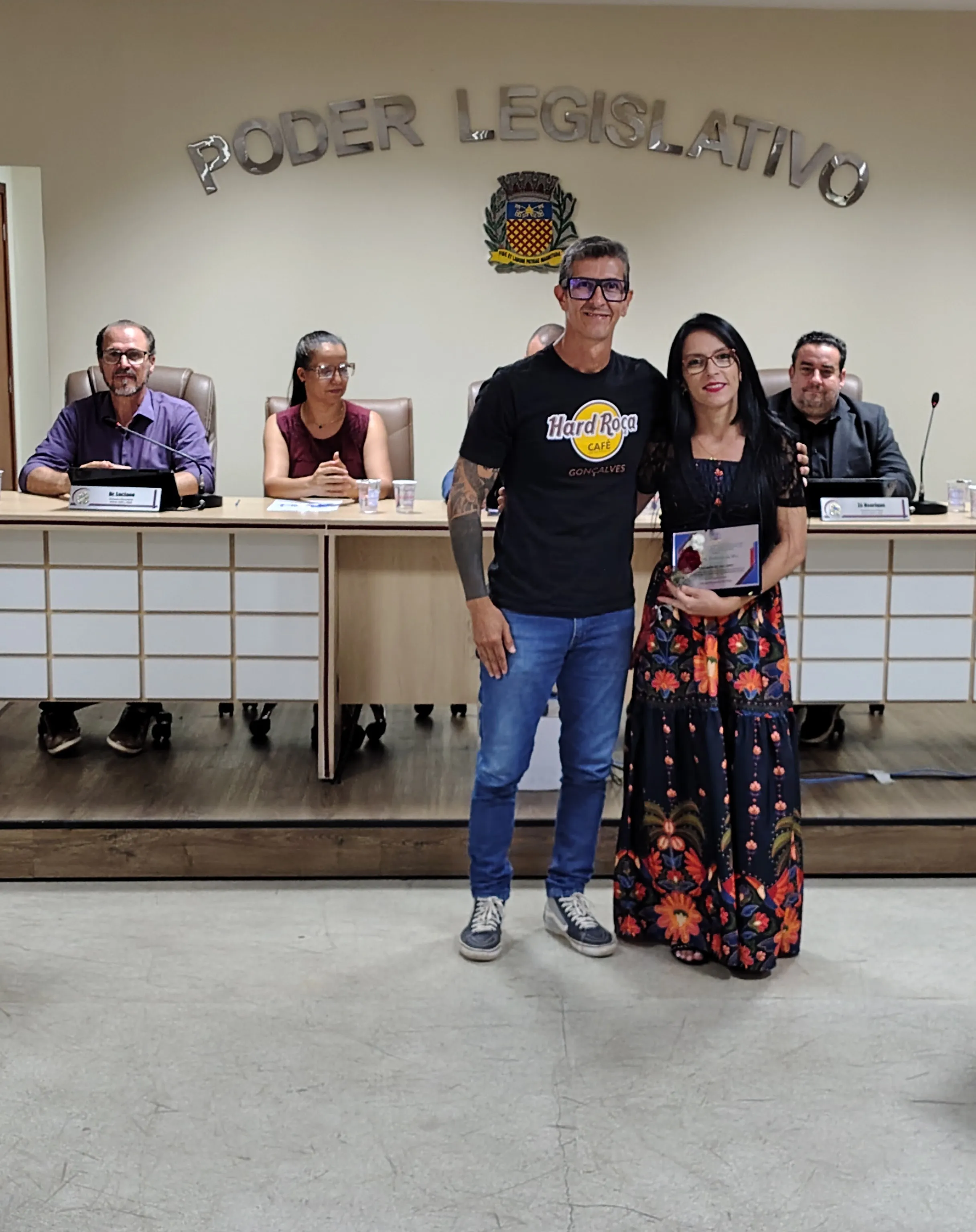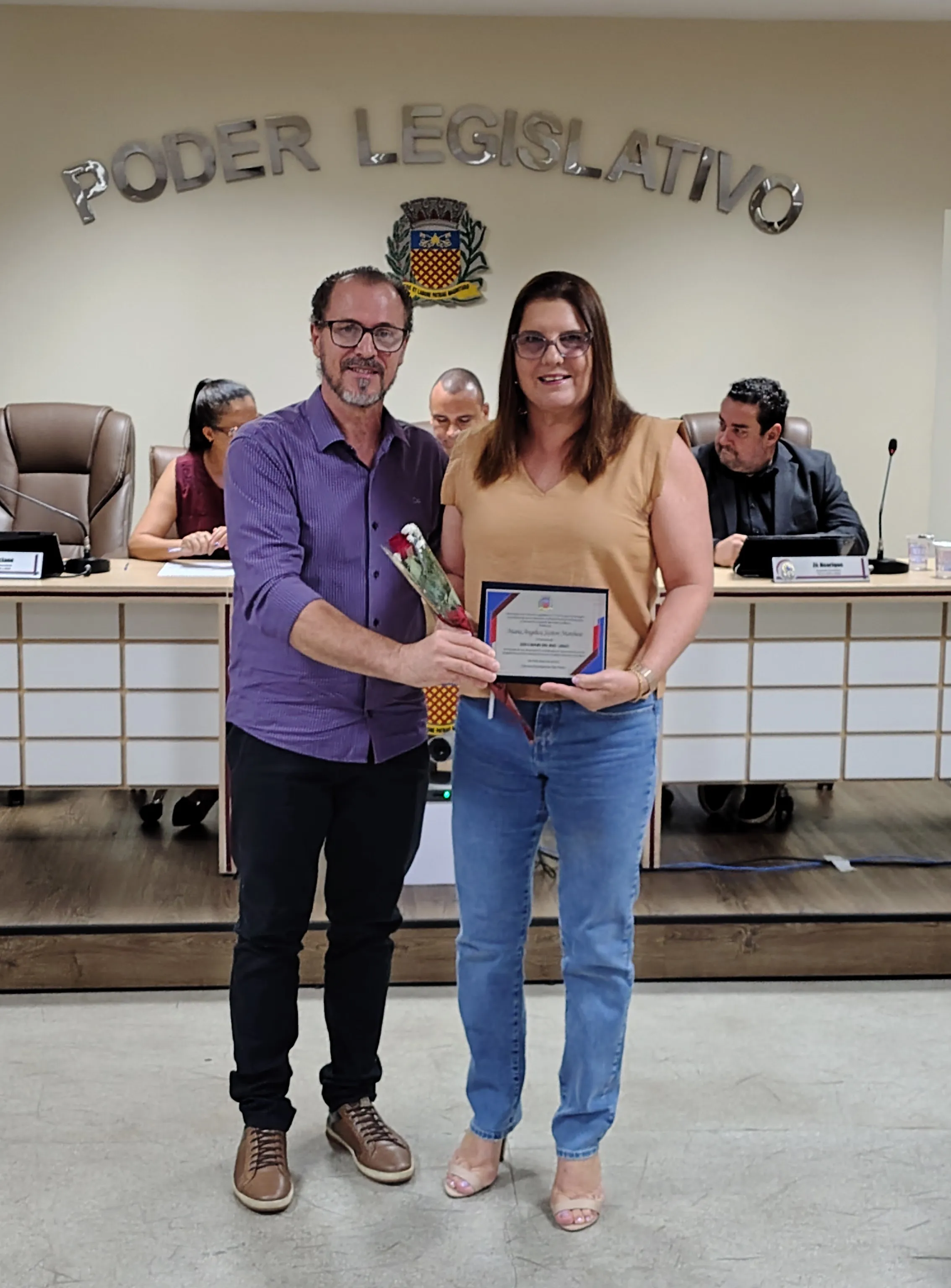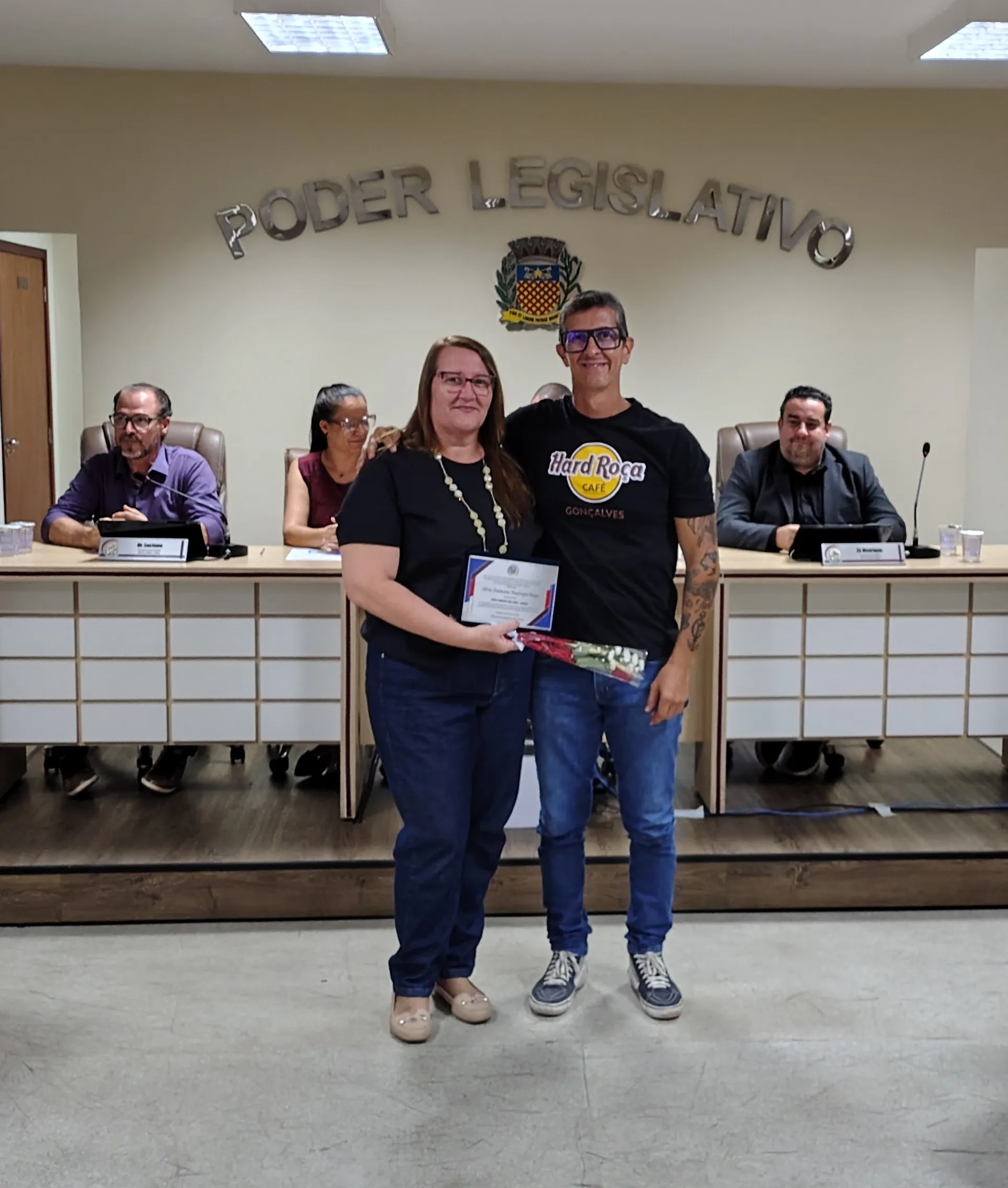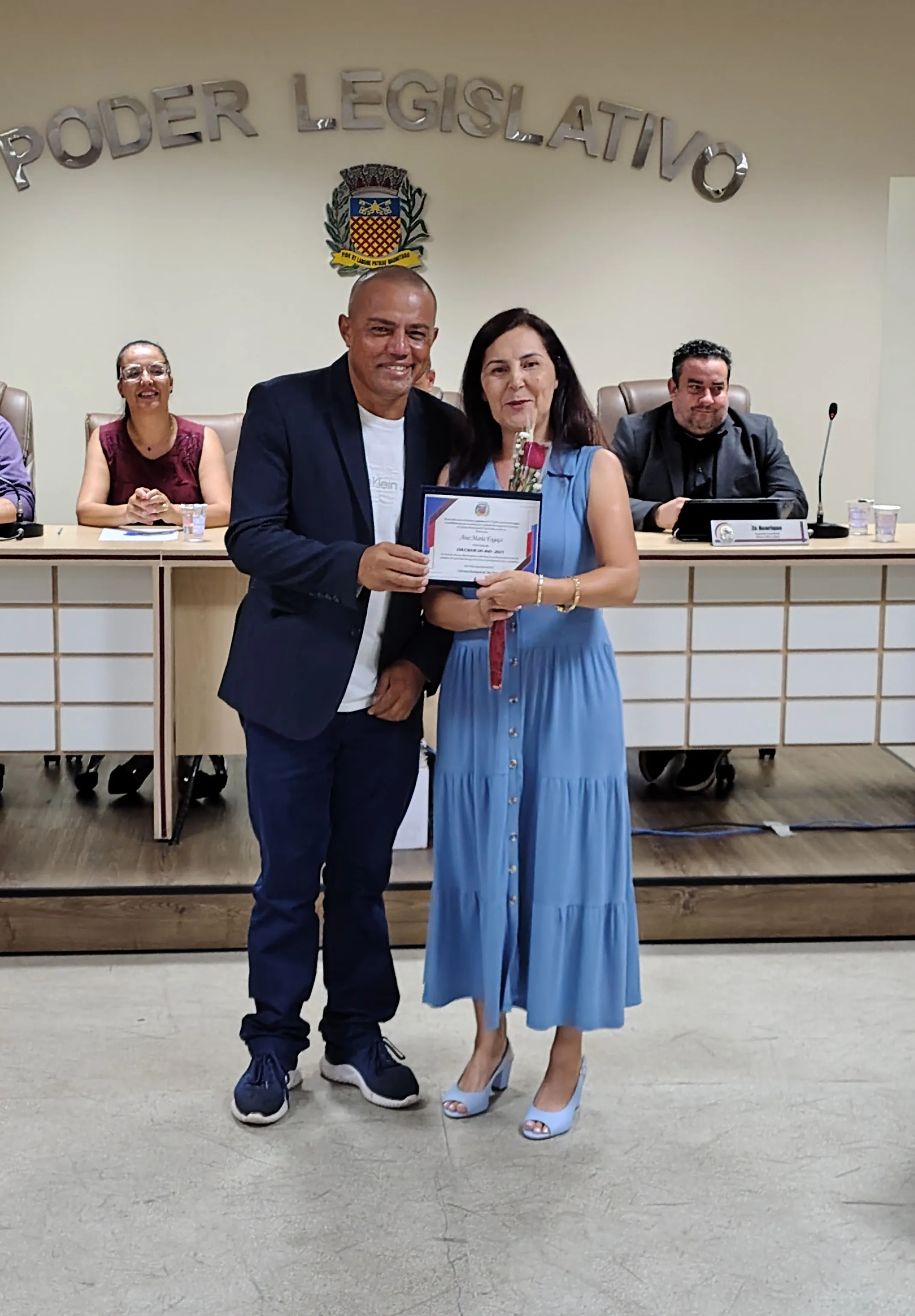 A solenidade foi conduzida pelo vereador Adriano Vitor, presidente da Casa. Além dele, a mesa central foi composta pelos vereadores Zé Henrique Pereira e Luciano Mazzonetto e pela secretária de Educação, Samanta Alves Almozara Bontorim.