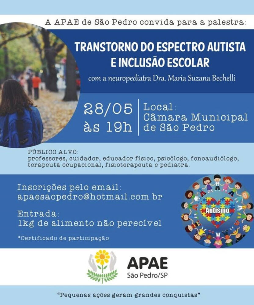 O evento organizado pela APAE São Pedro tem como público alvo, Professores, Cuidadores, Educadores Físicos, Psicólogos, Fonoaudiólogos, Terapeutas Ocupacionais, Fisioterapeutas e Pediatras.